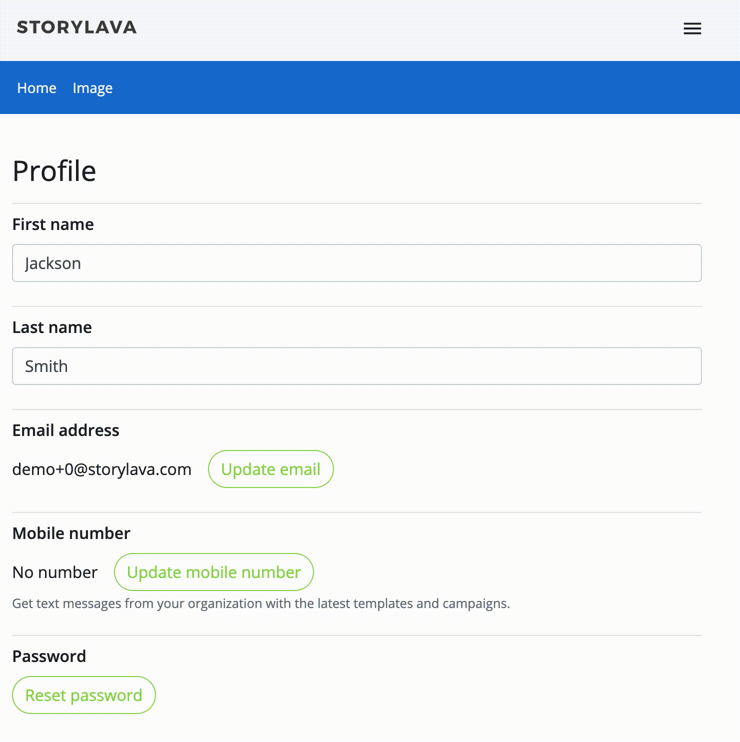 Adding your mobile number allows you to receive text message notifications of new templates when your organization posts them. To add your mobile number, press the Update mobile number button, enter your mobile phone number, and press Next. You'll be sent a confirmation code via text message to your phone. Then, to confirm your phone number, enter that confirmation code and press Save. If you don't confirm your mobile phone by entering a confirmation code, you may not be able to receive notifications correctly from Storylava.