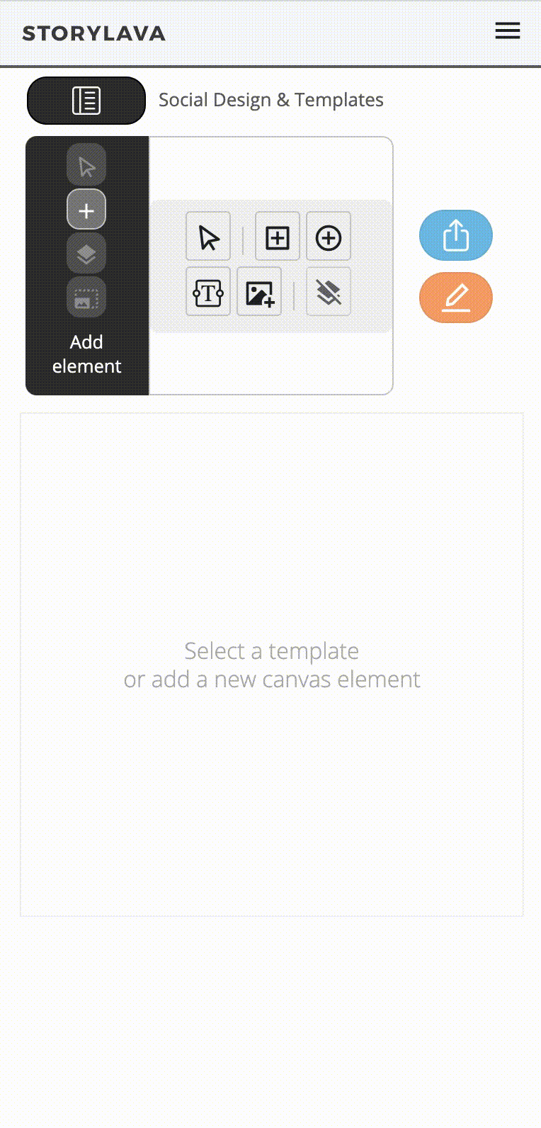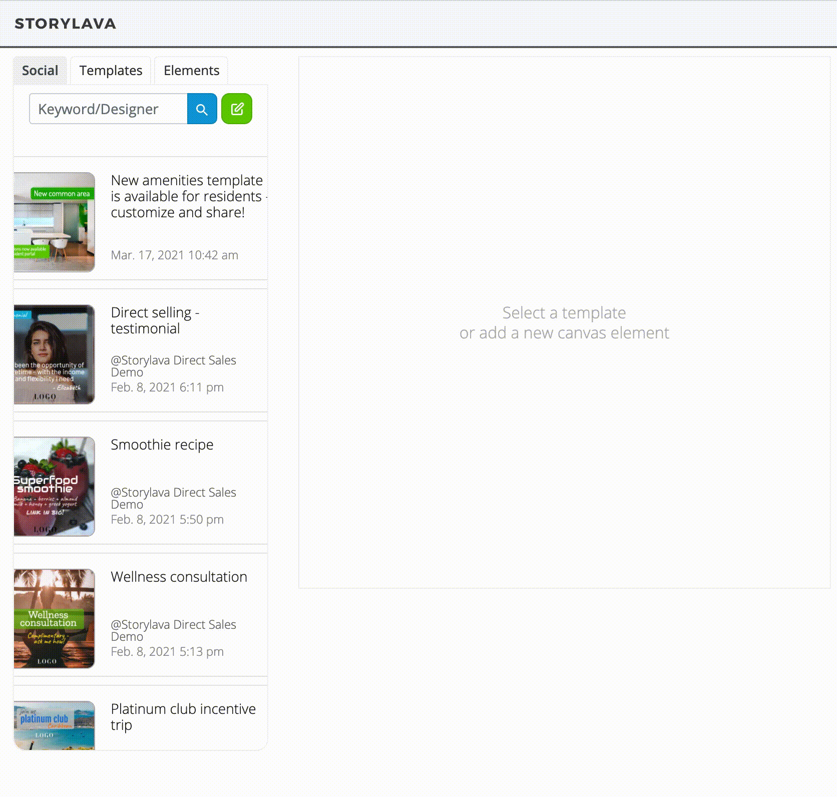 You can load templates that appear in your social feed. To load one of these templates, press the Social tab and make sure to clear the search field by pressing the X inside the search box. Templates of designers you follow, as well as those from your company will then be displayed. To load the template, press on the image thumbnail. To learn how to follow a designer so that their templates appear in your feed, go to Follow a Designer.