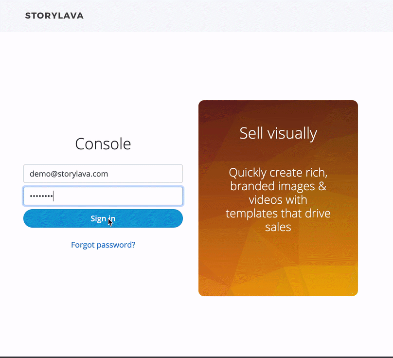 To sign in, navigate to the Storylava console, enter the email address and password found in your welcome email, and tap Sign in. When you sign in for the first time, you'll be prompted to change your password from the temporary one that was provided to you in the welcome email.